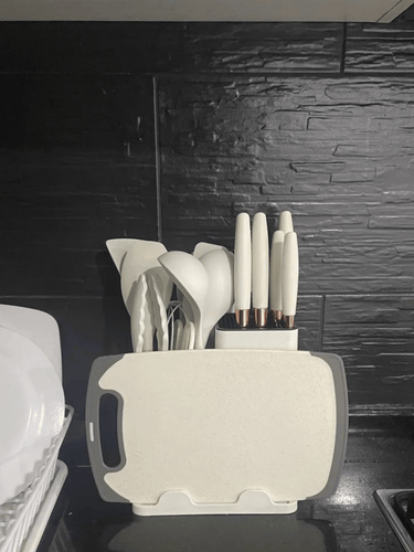 - Accesorios adicionales: Además de los cuchillos y utensilios de cocina, este set incluye tijeras, pinzas para batir y una tabla de cortar, todo lo que necesitas al alcance de tu mano.